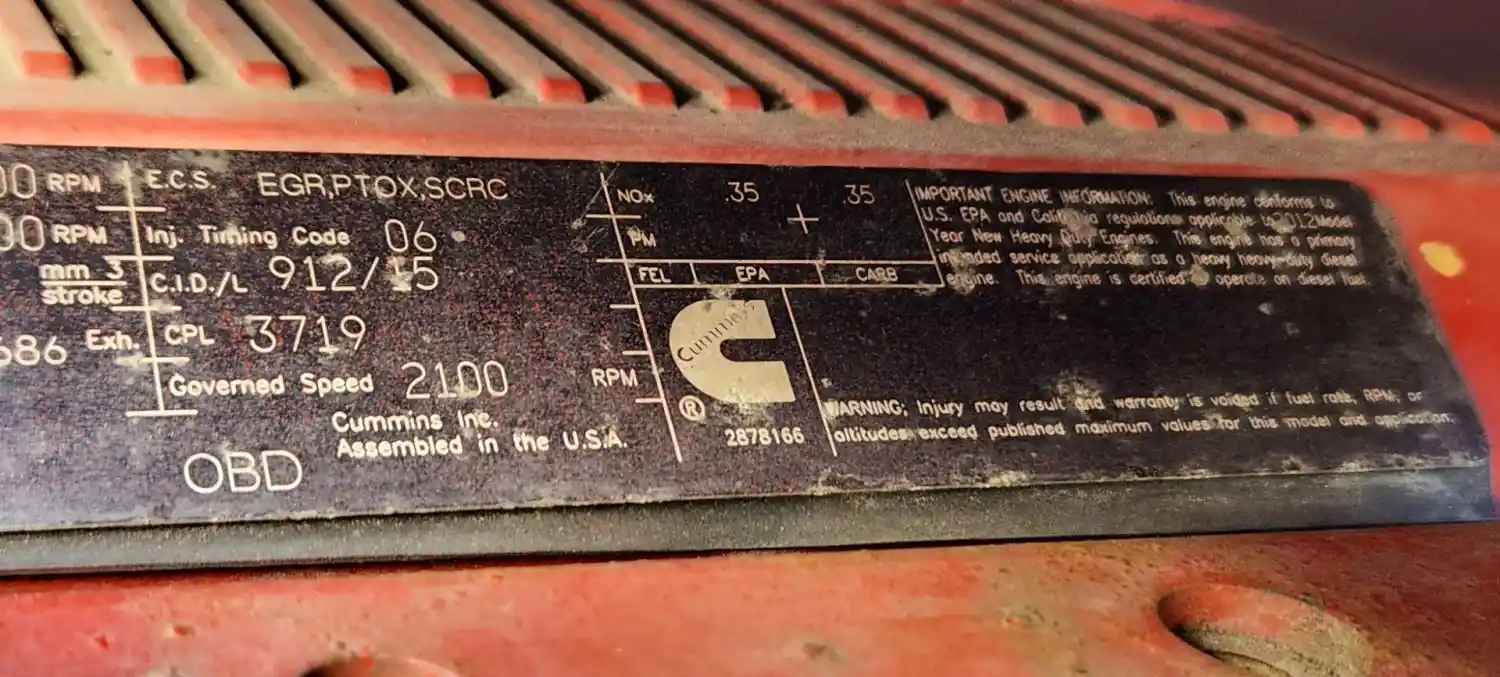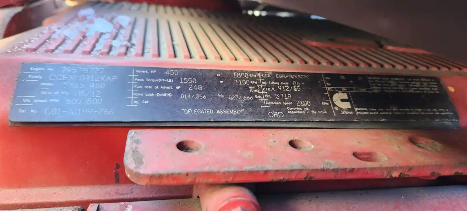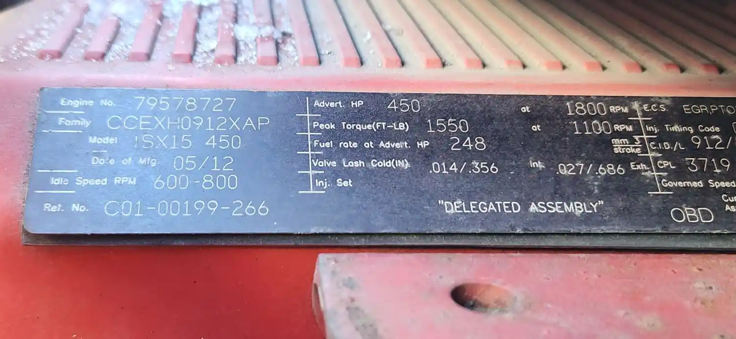 (Used) 2012 Cummins ISX15 450, ENGINE ASSEMBLY- Family Number: CCEXH0912XAP, Displacement: 14.9L, Horsepower: 450, Ar.No./CPL: 3719, Serial Number: 79578727, Part Number: C01-00199-266, E.C.S: EGR, PTOX, SCRC,