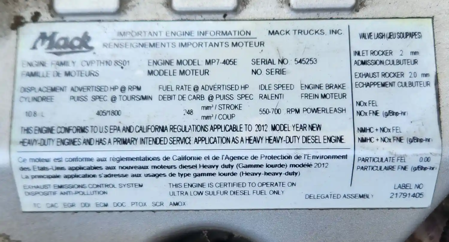 (Used) 2012 Mack MP7, ENGINE ASSEMBLY- Family Number: CVPTH10.8S01, Displacement: 10.8L, Horsepower: 405, Serial Number: 545253, Part Number: M741-5538, E.C.S: TC, CAC, EGR, DDI, ECM, DOC, PTOX, SCR, AMOX,