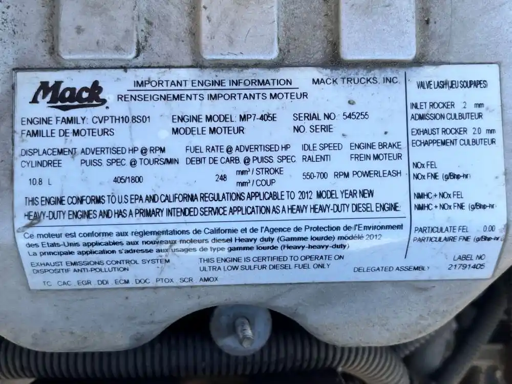 (Used) 2012 Mack MP7, ENGINE ASSEMBLY- Family Number: CVPTH10.8S01 Displacement: 10.8L Horsepower: 405, Serial Number: 545255, Part Number: 21791405, E.C.S: TC CAC, EGR. DDI. ECM. DOC. PTOX, SCR, AMOX, Reference images for condition, ,