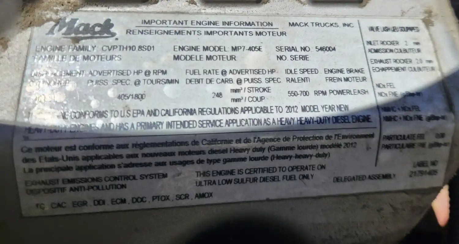 (Used) 2012 Mack MP7, ENGINE ASSEMBLY- Family Number: CVPTH10.8S01, Displacement: 10.8L, Horsepower: 405, Serial Number: 546004, ECS: TC, CAC, EGR, DDI, ECM, DOC, PTOX, SCR, AMOX,