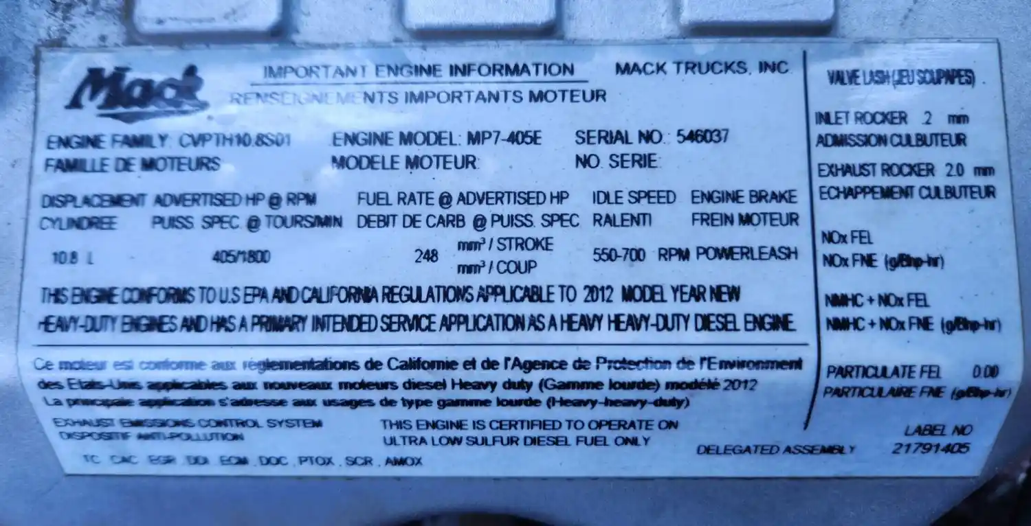 (Used) 2012 Mack MP7, ENGINE ASSEMBLY- Family Number: CVPTH10.8S01, Displacement: 10.8L, Horsepower: 405, Serial Number: 546037, ECS: TC, CAC, EGR, DDI, ECM, DOC, PTOX, SCR, AMOX,