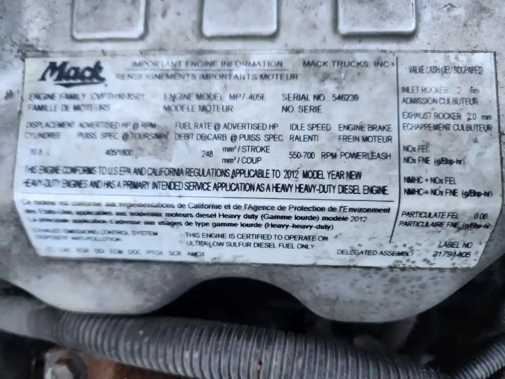 (Used) 2012 Mack MP7, ENGINE ASSEMBLY- Family Number: CVPTH10.8S01, Displacement: 10.8L, Horsepower: 405, Serial Number: 546239, ECS: TC, CAC, EGR, DDI, ECM, DOC, PTOX, SCR, AMOX,