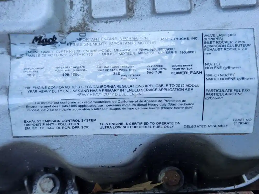 (Used) 2012 Mack MP7, ENGINE ASSEMBLY- Family Number: CVPTH10.8S01, Displacement: 10.8L, Horsepower: 405, Serial Number: 89039007, ECS: EM, EC, TC, CAC, DI, EGR, DPF, SCR,