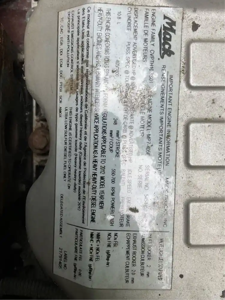 (Used) 2012 Mack MP7, ENGINE ASSEMBLY- Family Number: CVPTH10.8S01, Displacement: 10.8L, Horsepower: 405, Serial Number: 545445, E.C.S.: TC, CAC, EGR, DDI, ECM, DOC, PTOX, SCR, AMOX, ELKTON MD, 21921