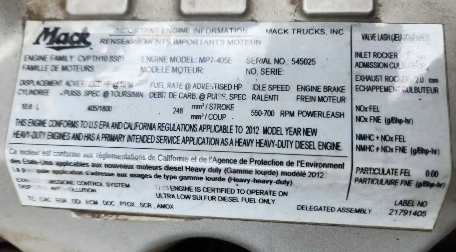 (Used) 2012 Mack MP7, ENGINE ASSEMBLY- Family Number: CVPTH10.8S01, Displacement: 10.8L, Horsepower: 405, Serial Number: 545025, ECS: TC, CAC, EGR, DDI, ECM, DOC, PTOX, SCR, AMOX,