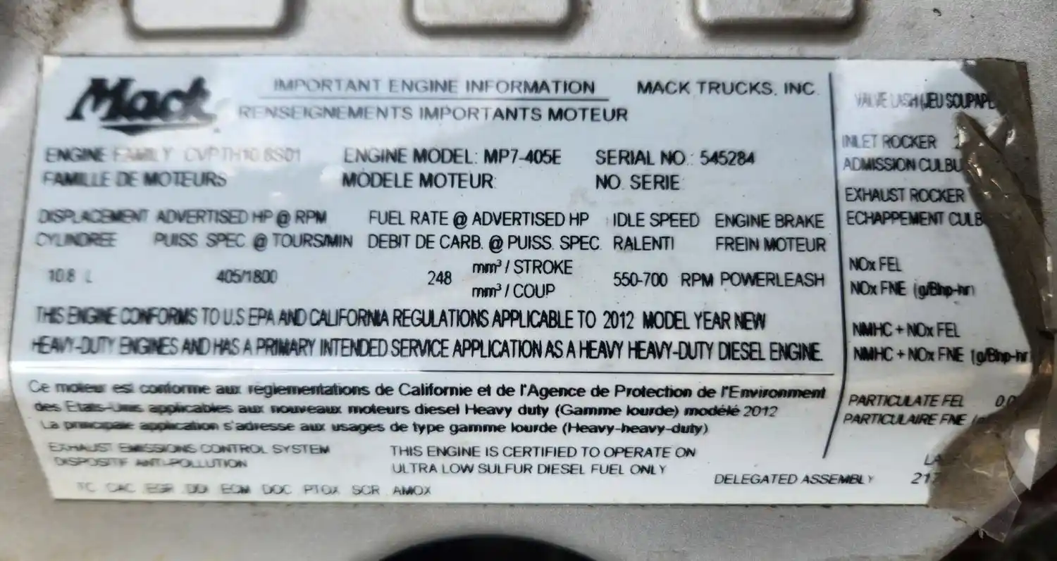 (Used) 2012 Mack MP7, ENGINE ASSEMBLY- Family Number: CVPTH10.8S01, Displacement: 10.8L, Horsepower: 405, Serial Number: 545284, ECS: TC, CAC, EGR, DDI, ECM, DOC, PTOX, SCR, AMOX,