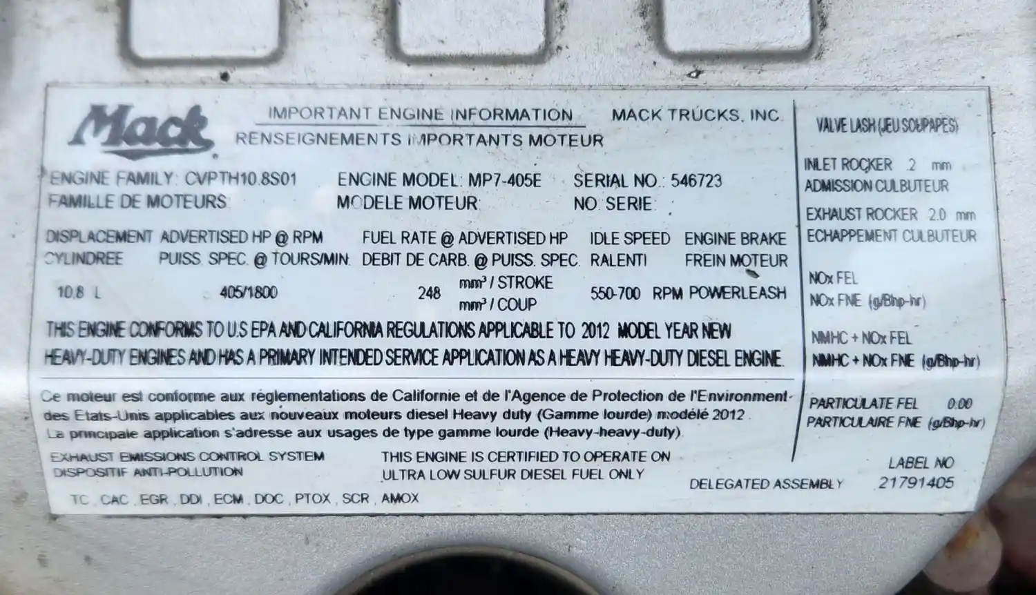 (Used) 2012 Mack MP7, ENGINE ASSEMBLY- Family Number: CVPTH10.8S01, Displacement: 10.8L, Horsepower: 405, Serial Number: 546723, Part Number: M741-6096, E.C.S: TC, CAC, EGR, DDI, ECM, DOC, PTOX, SCR, AMOX,
