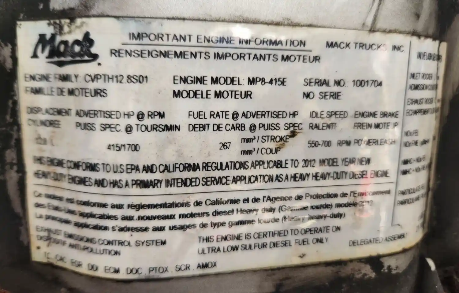 (Used) 2012 Mack MP8, ENGINE ASSEMBLY- Family Number: CVPTH12.8S01, Displacement: 12.8L, Horsepower: 415, Serial Number: 1001704, E.C.S: TC, CAC, EGR, DDI, ECM, DOC, PTOX, SCR, AMOX, Reference images for condition