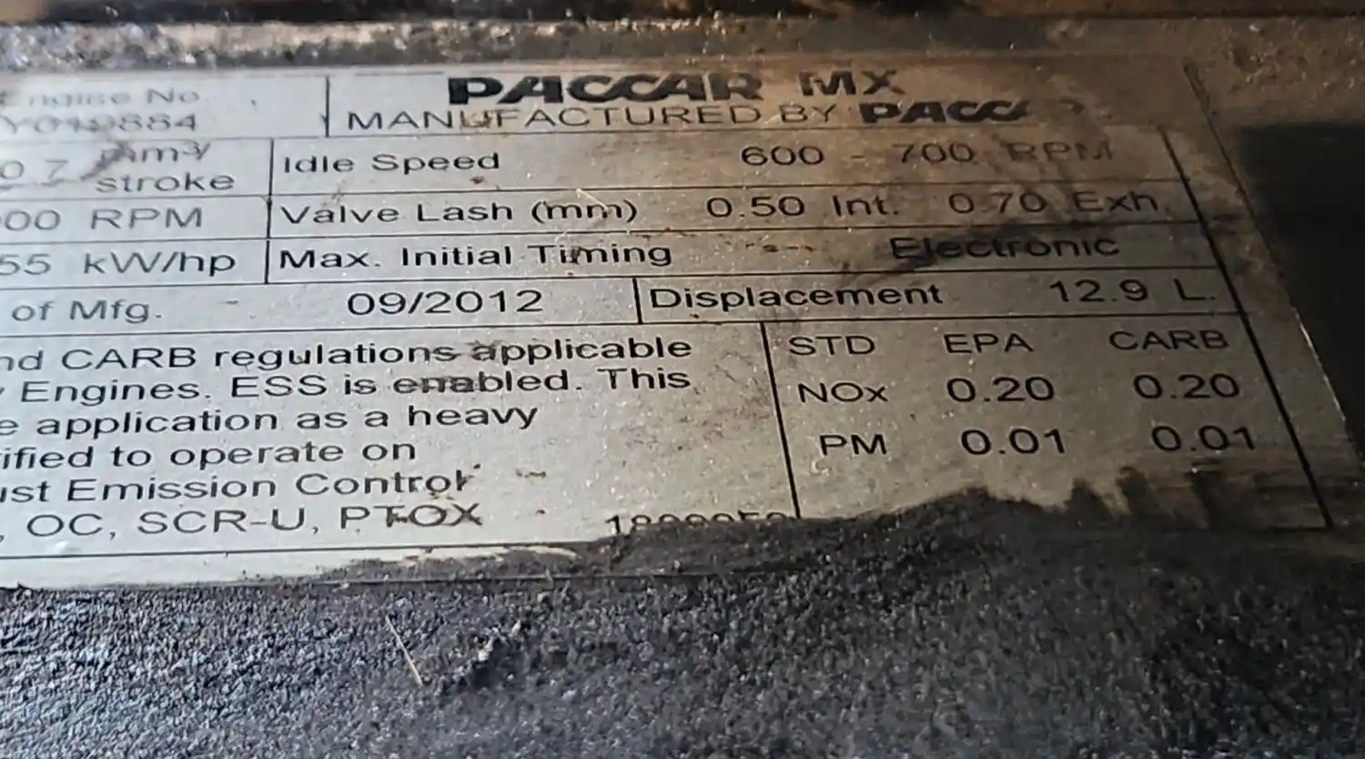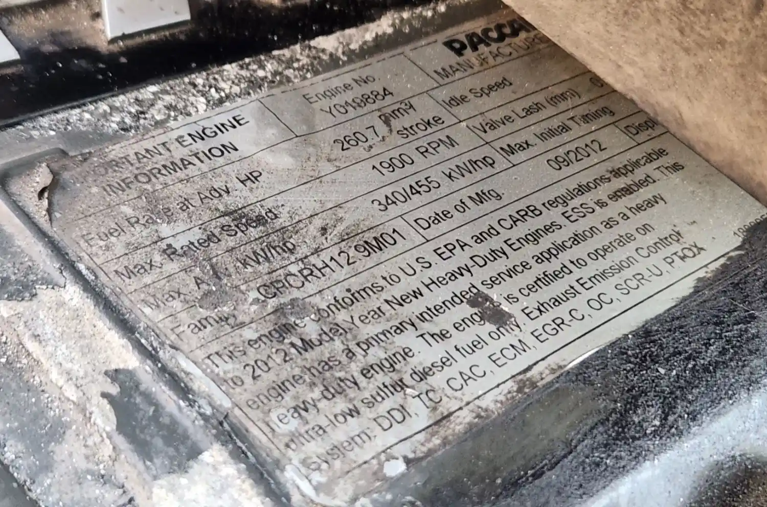 (Used) 2012 PACCAR MX13, ENGINE ASSEMBLY- Family Number: CPCRH12.9M01, Displacement: 12.9L, Horsepower: 455, Serial Number: Y019884, E.C.S: DDI, TC, CAC, ECM, EGR-C, OC, SCR-U, PTOX,