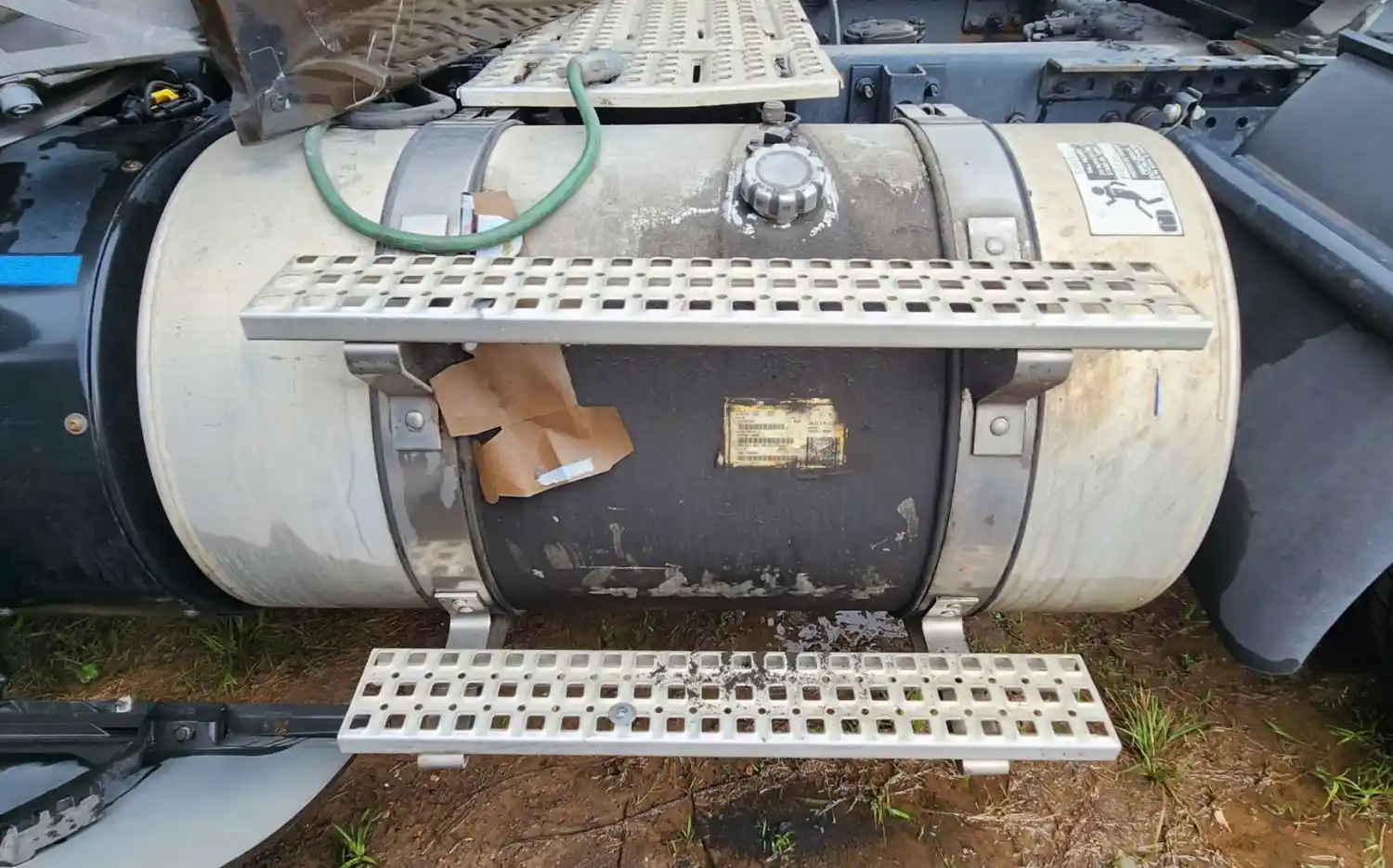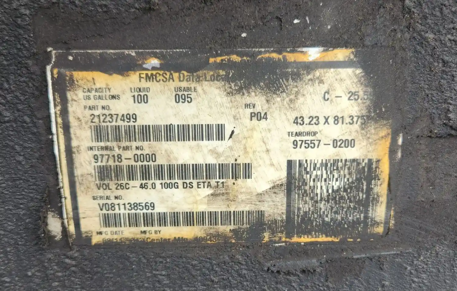 (Used) 2012 Volvo VNL, FUEL TANK- Serial Number: V081138569, Part Number: 21237499, Internal Part Number: 97718-0000, Side: Driver Left Side, Capacity: 100 Gallons, Material: Aluminum, Shape: Cylinder, Dimensions: Length=45", Height=26", ,