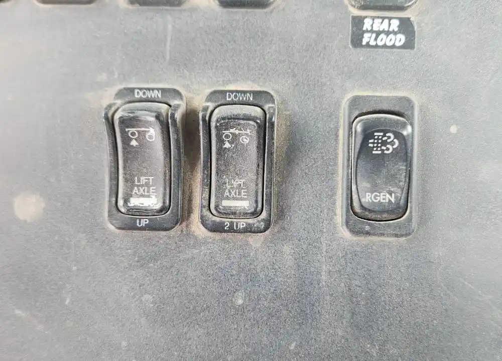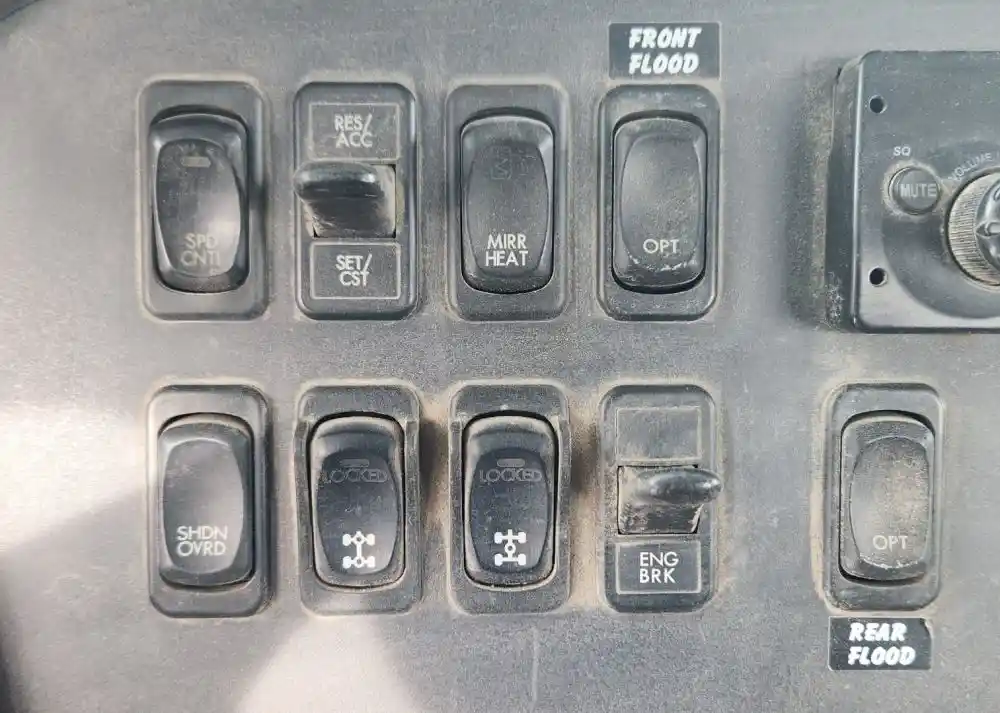 (Used) 2013 Freightliner 114SD, MISCELLANEOUS DASH SWITCHES- Controls: Spd Cntl, Res/Acc-Set Cst, Mirr Heat, Front Flood OPT, Shdn Ovrd, Front Rear Axle Lock, Rear Rear Axle Lock, Engine Brake, Rear Flood OPT, Lift Axle Down-Up, Lift Axle (2) Down-Up, Particulant Filter Regeneration, Material: Plastic,