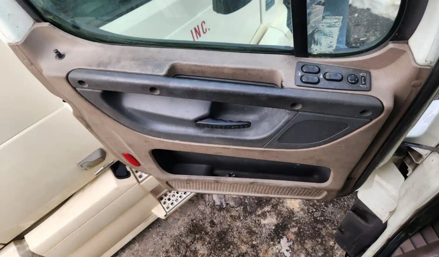 (Used) 2013 Freightliner Cascadia 125, INTERIOR DOOR PANEL- Side: Driver Left Side, Color: Tan with Grey, Type: Power, Material: Plastic, Reference images for condition,