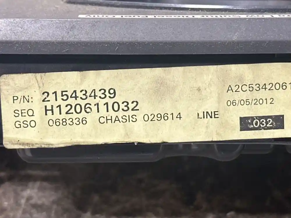 (Used) 2013 Mack CXU613, INSTRUMENT CLUSTER- part Number: 21543439, Gauges: Def Level, Trans Temp, RPM, MPH, Exhaust, Coolant temp, Engine oil press, Fuel level, Air pressure (1), Air pressure (2), Engine Oil temp, Reference images for condition. ,