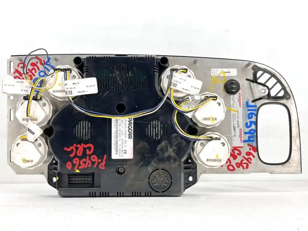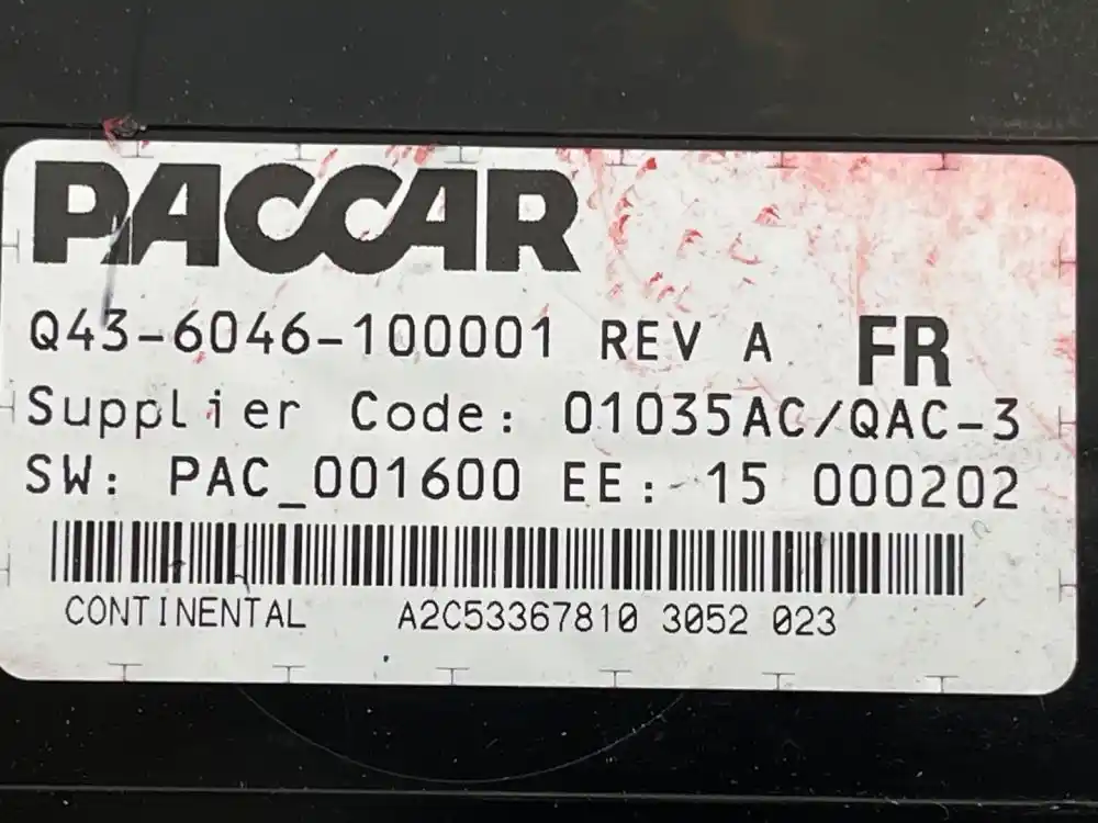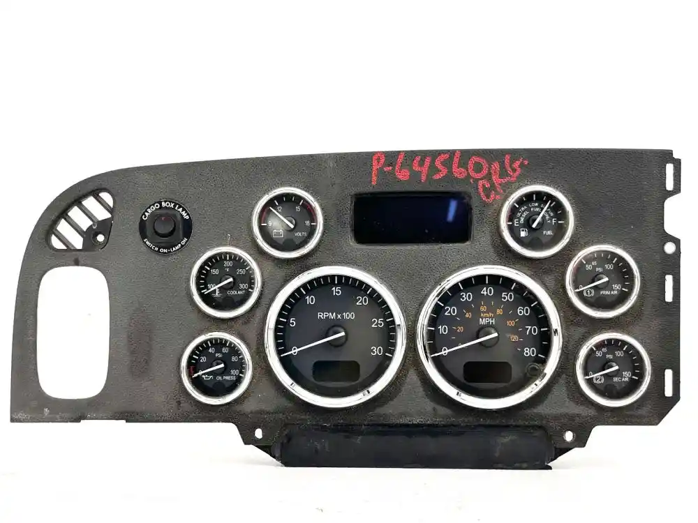 (Used) 2013 Peterbilt 386, INSTRUMENT CLUSTER- Part Number: Q43-6046-100001 Serial Number: A2C53367810 3052 023 Supplier Code; 01035AC/QAC-3 REV A FR SW: PAC_001600 EE: 15 000202 Gauges: Battery Voltage, Coolant Temperature, Engine Oil Pressure, RPM, Speedo, Fuel Level, Primary Air Pressure (1), Secondary Air Pressure (2), DIGITAL INFO CENTER. Trip A / B, Mileage, Cargo Box Lamp Switch Material: Plastic, Plug / Pin: 1 Rectangular Plug: 14 Pins, 1 Round Plug 3Pins, Reference images for condition. ,