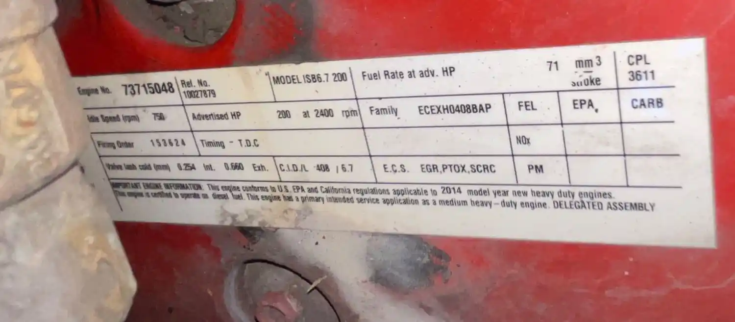 (Used) 2014 Cummins ISB 6.7, ENGINE ASSEMBLY- Family Number: ECEXH0408BAP, Displacement: 6.7L, Horsepower: 200, Ar.No./ CPL: 3611, Serial Number: 73715048, Part Number: 10027879, ECS: EGR, PTOX, SCRC, Mileage: 165,285.60,