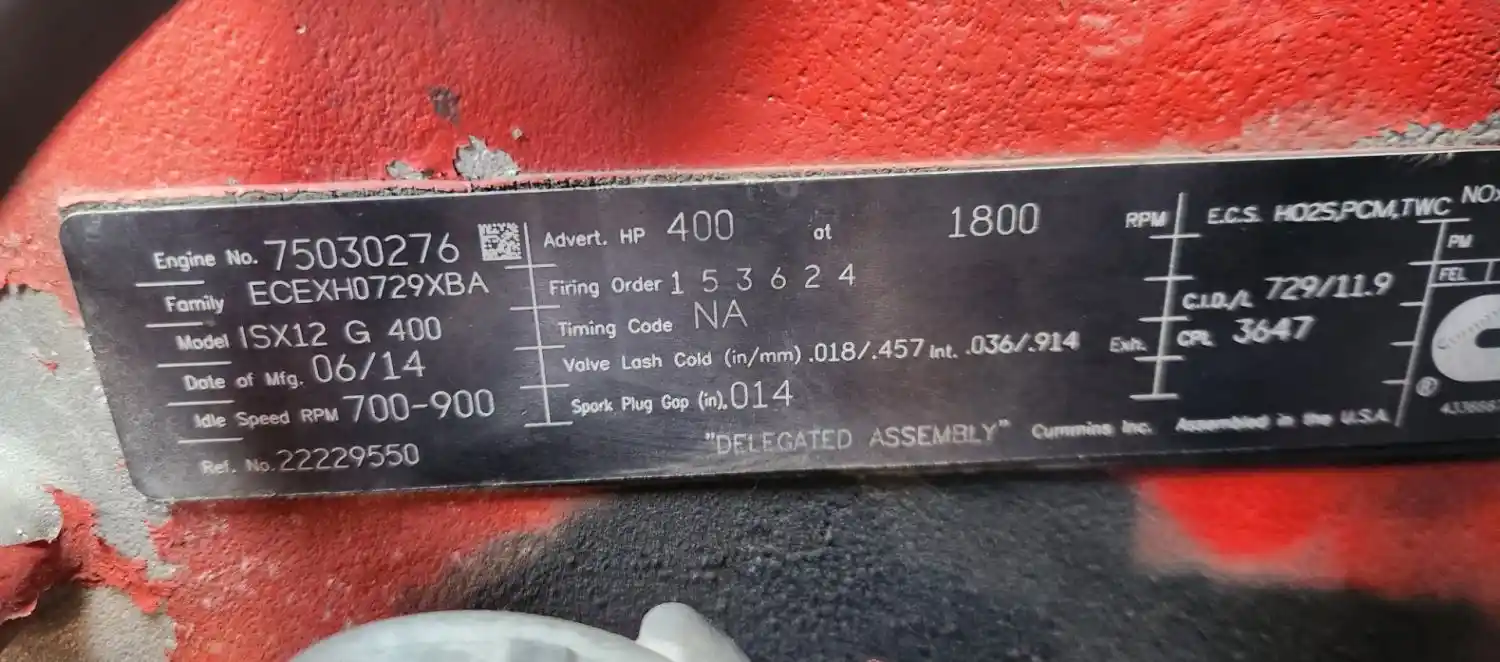 (Used) 2014 Cummins ISX12-G, ENGINE ASSEMBLY- Family Number: ECEXH0729XBA, Displacement: 11.9L, Horsepower: 400, Ar.No./CPL: 3647, Serial Number: 75030276, Part Number: 22229550, E.C.S: HO2S, PCM, TWC, Fuel: LNG,