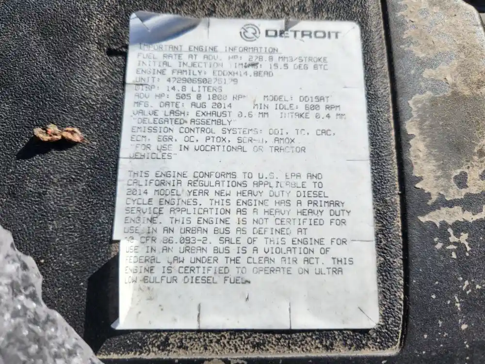 (Used) 2014 Detroit DD15, ENGINE ASSEMBLY- Family Number: EDDXH14.8EAD, Displacement: 14.8L, Horsepower: 505, Serial Number: 472906S0275179, Part Number: C01-00220-069, E.C.S: DDI, TC, CAC, ECM, EGR, OC, PTOX, SCR-U, AMOX,