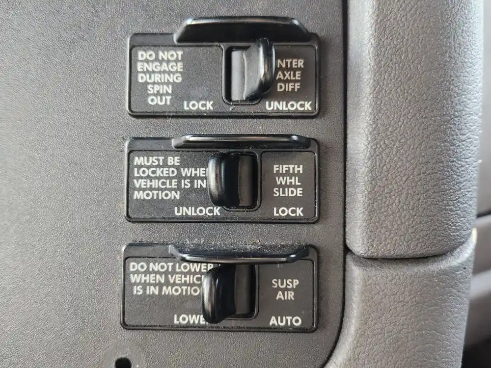 (Used) 2014 Freightliner Cascadia 125, MISCELLANEOUS DASH SWITCHES- Controls: Trailer Brake, Inter Axle Diff, Fifth Wheel Slide, Suspension Air, Material: Plastic with Aluminum, Reference images for condition,