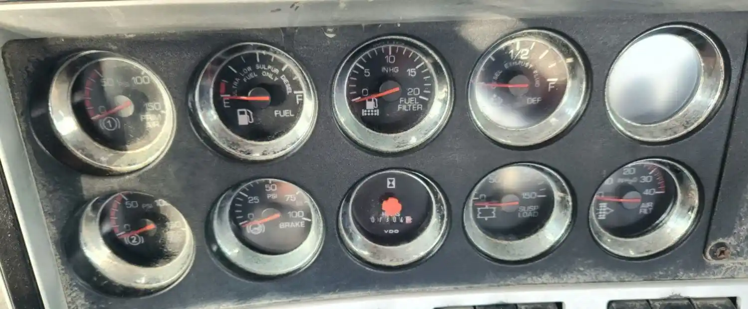 (Used) 2014 Kenworth T800, INSTRUMENT CLUSTER- Gauges: Brake Air Pressure (1), Fuel Level, Fuel Filter, Def Level, Brake Air Pressure (2), Air Pressure, Hours, Sus Load, Air Filter, Material: Plastic,