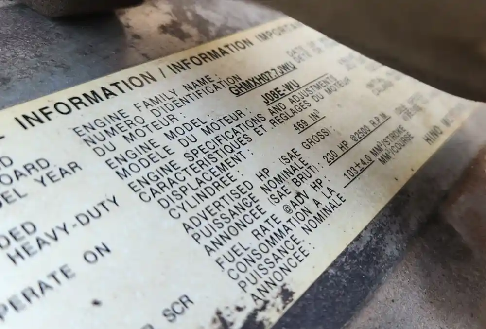 (Used) 2016 Hino J08E-WU, ENGINE ASSEMBLY- Family Number: GHMXH07.7JWU, Displacement: 7.6L, Horsepower: 230, Serial Number: J08EWU13532, ECS: DFI, TC, CAC, ECM, PTOX, OC, EGR, SCR, Reference images for condition