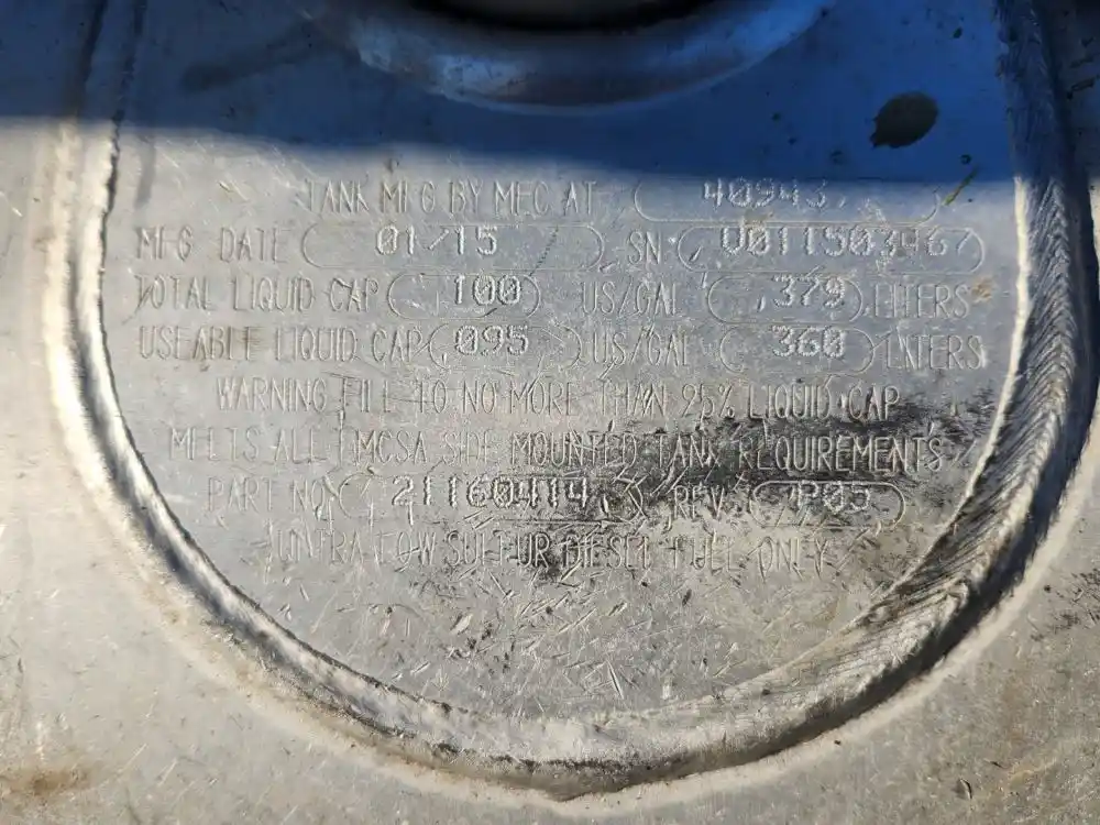 (Used) 2016 Volvo VNL, FUEL TANK- Part Number: 21160414 Serial Number: V011503467, Side: Driver Left Side, Capacity: 100 Gallons, Material: Aluminum, Shape: Round, Dimensions: L=43.5", D=26", It's Dented!! Reference images for condition,