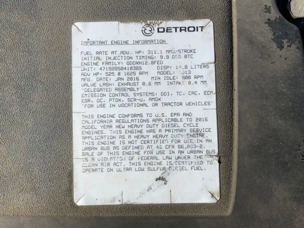 (USED) 2017 Detroit Diesel DD13. Complete Engine. Engine Serial # 471928S0410389 Engine Family # GDDXH12.8FED Engine HP: 525 Engine Model: DD13 Displacement: 12.8 CPL/AR:4719 REF:GDDXH12.8FED E.C.S.: DDI/ TC/ CAC/ ECM/ EGR/ OC/ PTOX/ SCR-U/ AMOX Tested and Runs GREAT!!! To find out more about this engine, give us a call.