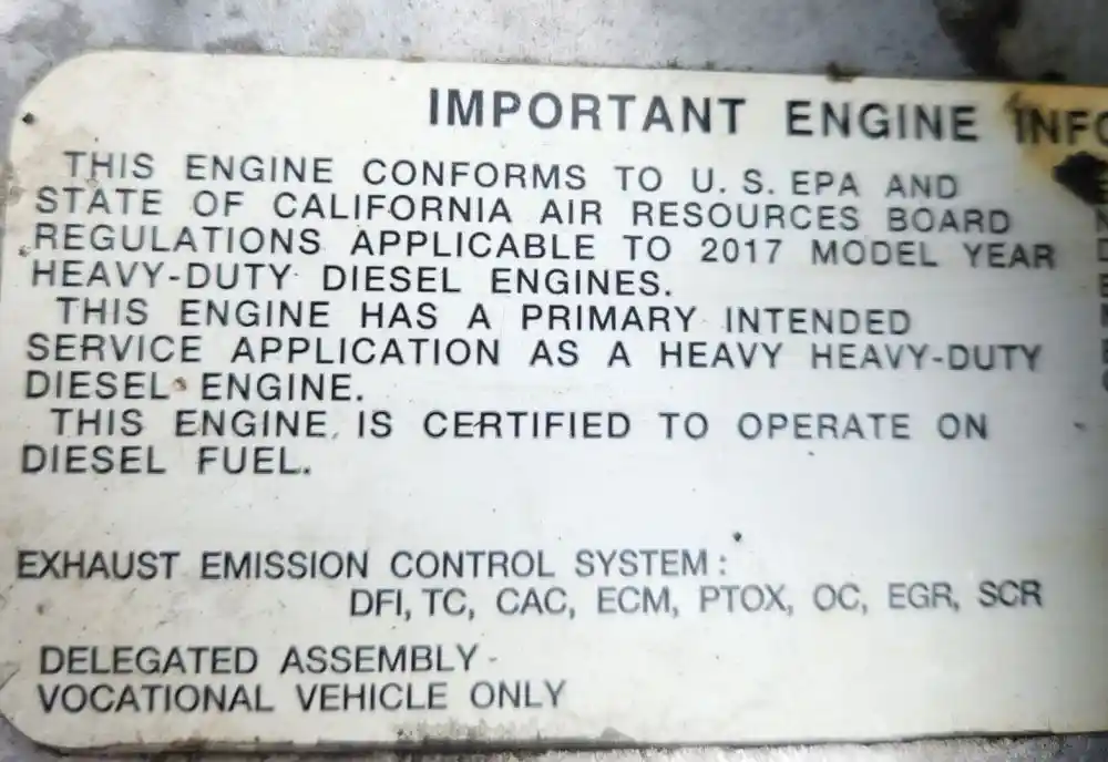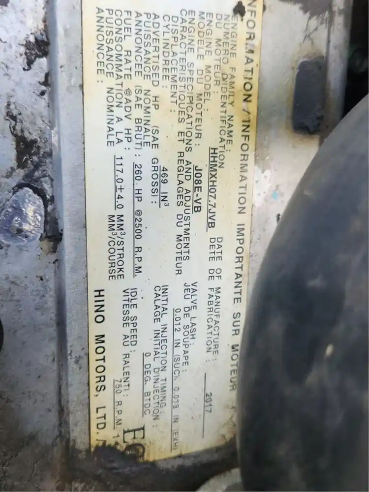 (Used) 2017 Hino J08, ENGINE ASSEMBLY- Family Number: HHMXH07.7JVB, Displacement: 7.6L, Horsepower: 260, E.C.S: DFI, TC, CAC, ECM, PTOX, OC, EGR, SCR,
