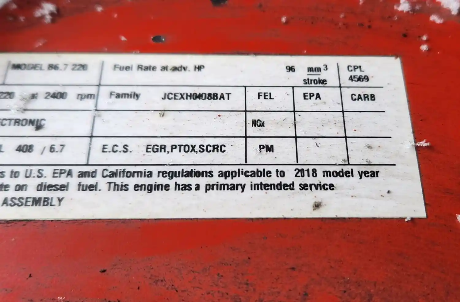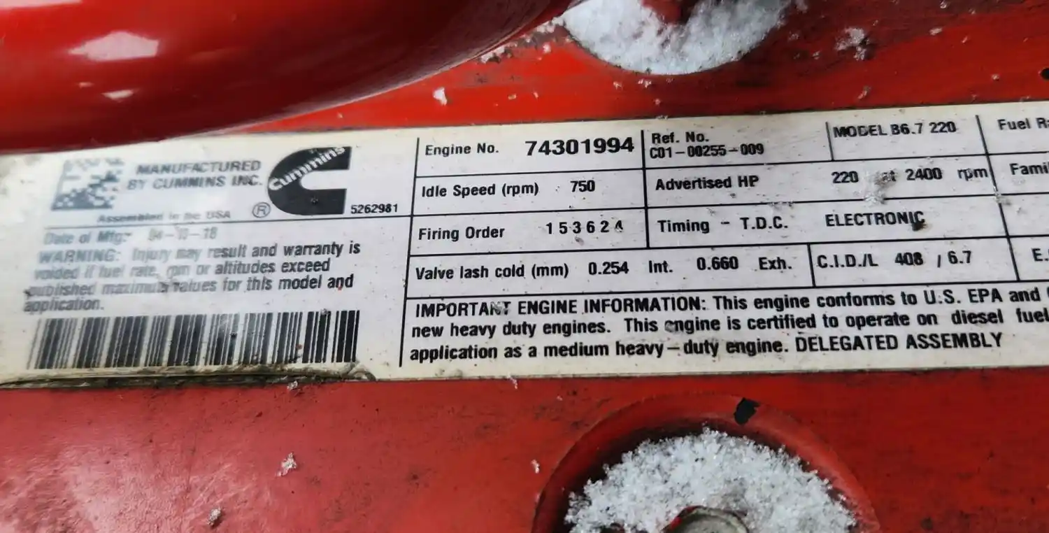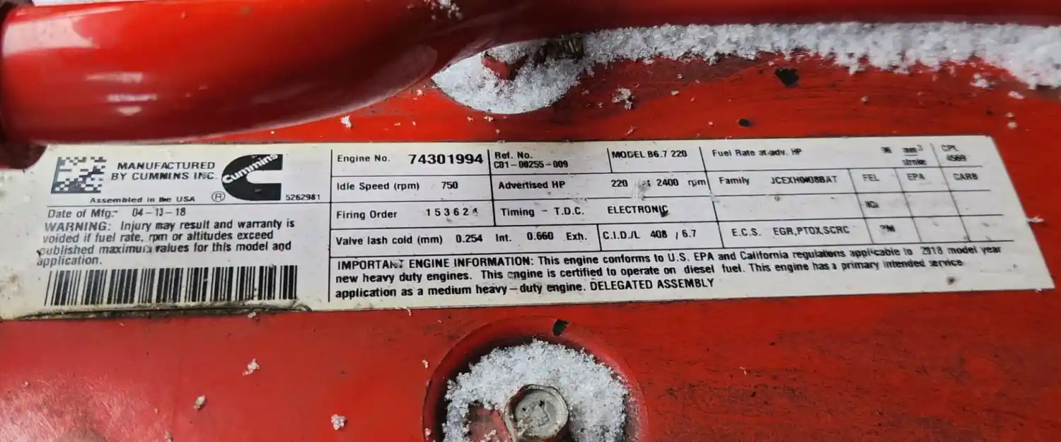 (Used) 2018 Cummins B6.7 220, ENGINE ASSEMBLY- Family Number: JCEXH0408BAT, Displacement: 6.7L, Horsepower: 220, Ar.No./CPL: 4569, Serial Number: 74301994, Part Number: C01-00255-009, E.C.S: EGR, PTOX, SCRC,