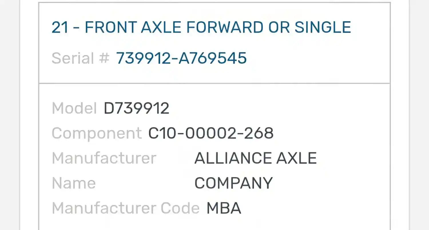 (Used) 2018 Freightliner M2 106, COMPLETE FRONT AXLE- Part Number: C10-00002-268, Serial Number: 739912-A769545, Center Leaf to Center Leaf: 33", Make: Detroit, Model: DA-F-10.0-3, Capacity: 10,000 Lbs, Hub Bolts: 10, Brake Type: Drum, Reference images for condition, ,