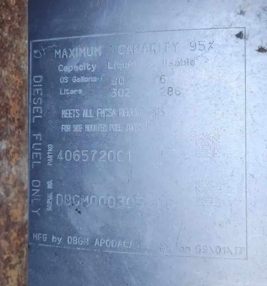 (Used) 2018 international LT625, FUEL TANK- Part Number: 4065720C1, Serial Number: DBGM000305676, Side: Driver Left Side, Capacity: 80 Gallons, Material: Aluminum, Shape: Cylinder, Dimensions: Length=37", Height=26", ,