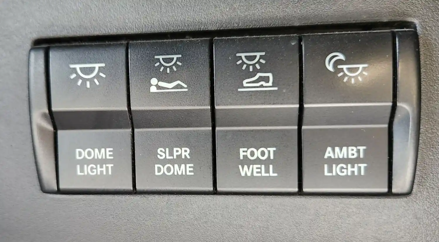 (Used) 2019 Freightliner Cascadia 126, MISCELLANEOUS DASH SWITCHES- Controls: Dome Light, Sleeper Dome, Foot Well, Ambt Light, Material: Plastic, Reference images for condition,