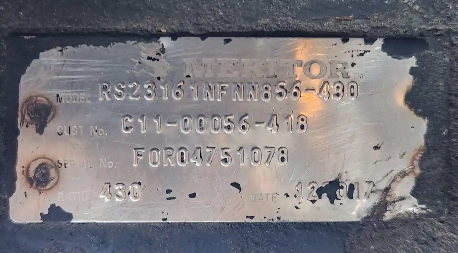 (Used) 2019 Freightliner M2 112 Medium Duty, COMPLETE REAR DIFFERENTIAL- Part Number: C11-00056-418, Serial Number: FOR04751078, Make: Meritor, Model: RS23-161, Ratio: 4.38, Capacity: 21,000 Lbs, Hub Bolts: 10, Brake Type: Drum, Suspension: Air Suspension,