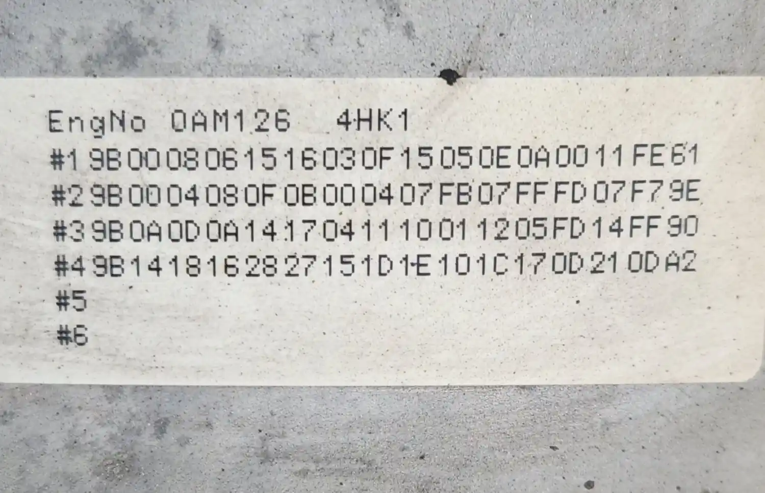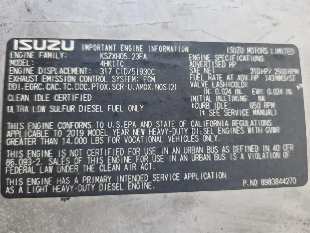 (Used) 2019 Isuzu 4HK1-TC, ENGINE ASSEMBLY- Family Number: KSZXH05.23FA, Displacement: 5.2L, Horsepower: 210, Part Number: 8983844270, Serial Number: 0AM126 E.C.S.: ECM,DDI,EGRC,CAC,TC,DOC,PTOX,SRC-U,AMOX,NOS,(2),