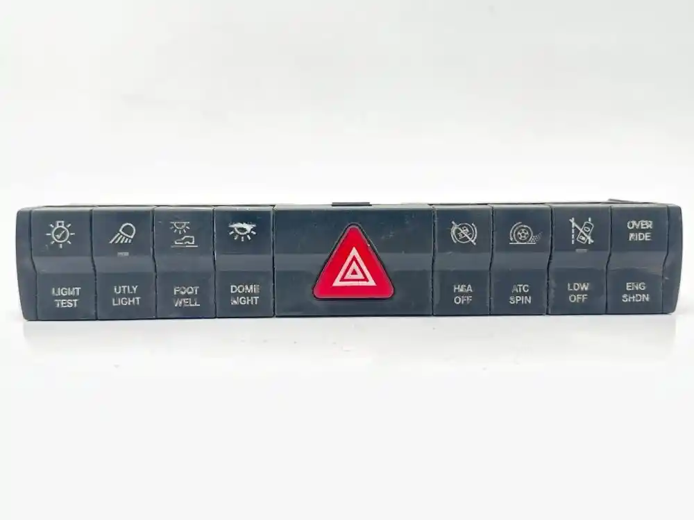 (Used) 2020 Freightliner Cascadia 116 Day Cab, MISCELLANEOUS DASH SWITCHES- Part Number: A06-90731-000, Controls: Light Test, Utly Light, Foot Well, Dome Light, hazard Lights, HSA OFF, ATC Spin, LDW Off, Over Ride / ENG SHDN, Material: Plastic, Reference images for condition. ,
