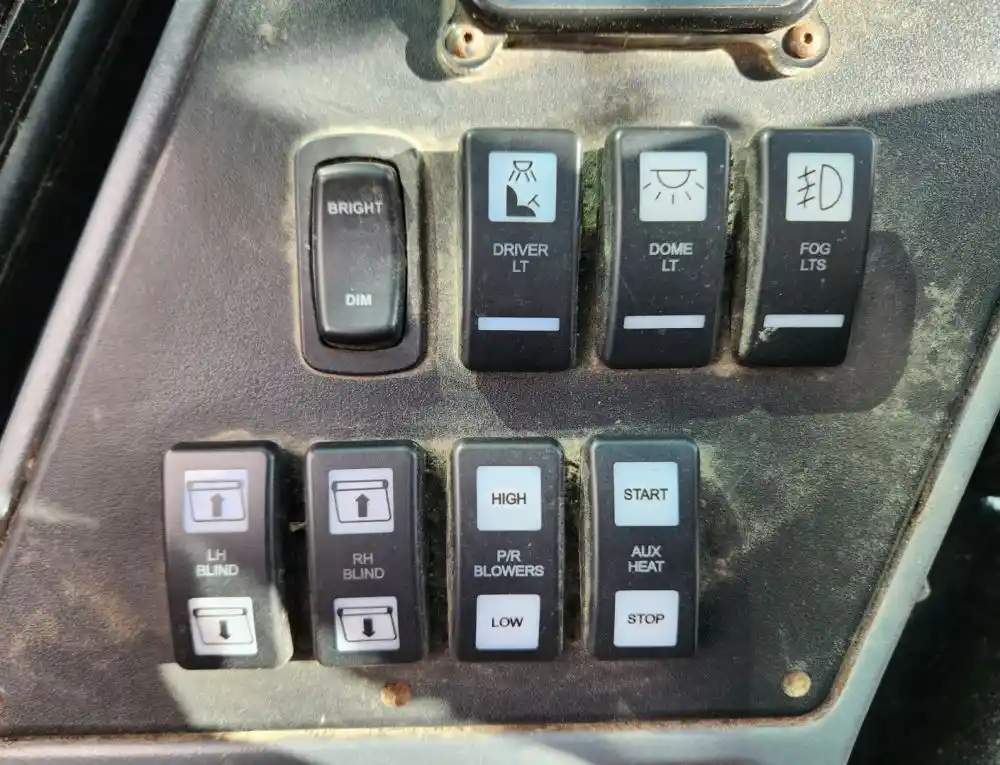 (Used) 2021 MCI D4505, MISCELLANEOUS DASH SWITCHES- Controls: 110V On, Chime, Start, Engine Over Ride, Bright-Dim, Driver LT, Dome LT, Fog Lts, LH Blind, RH Blind, P/R Blowers, Aux Heat, Material: Plastic,