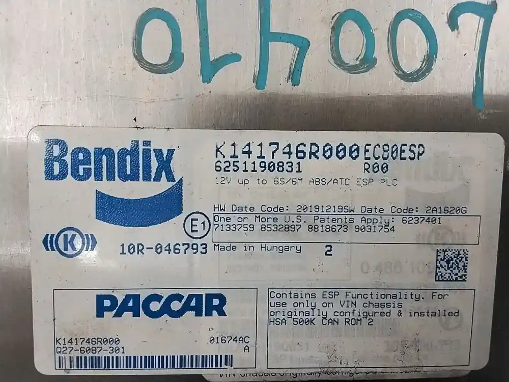 (Used) 2021 Peterbilt 579 (ABS ECMs) Part Number: K141746R000 Serial Number: 6251190831 EC8ESP HW Date Code: 20191219SW Date Code: 2A1620G 10R-046793 Q27-6087-301 A ML626GH6P 0 486 109 218