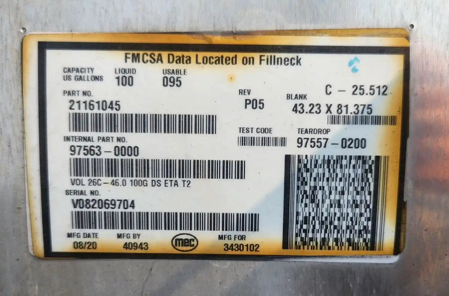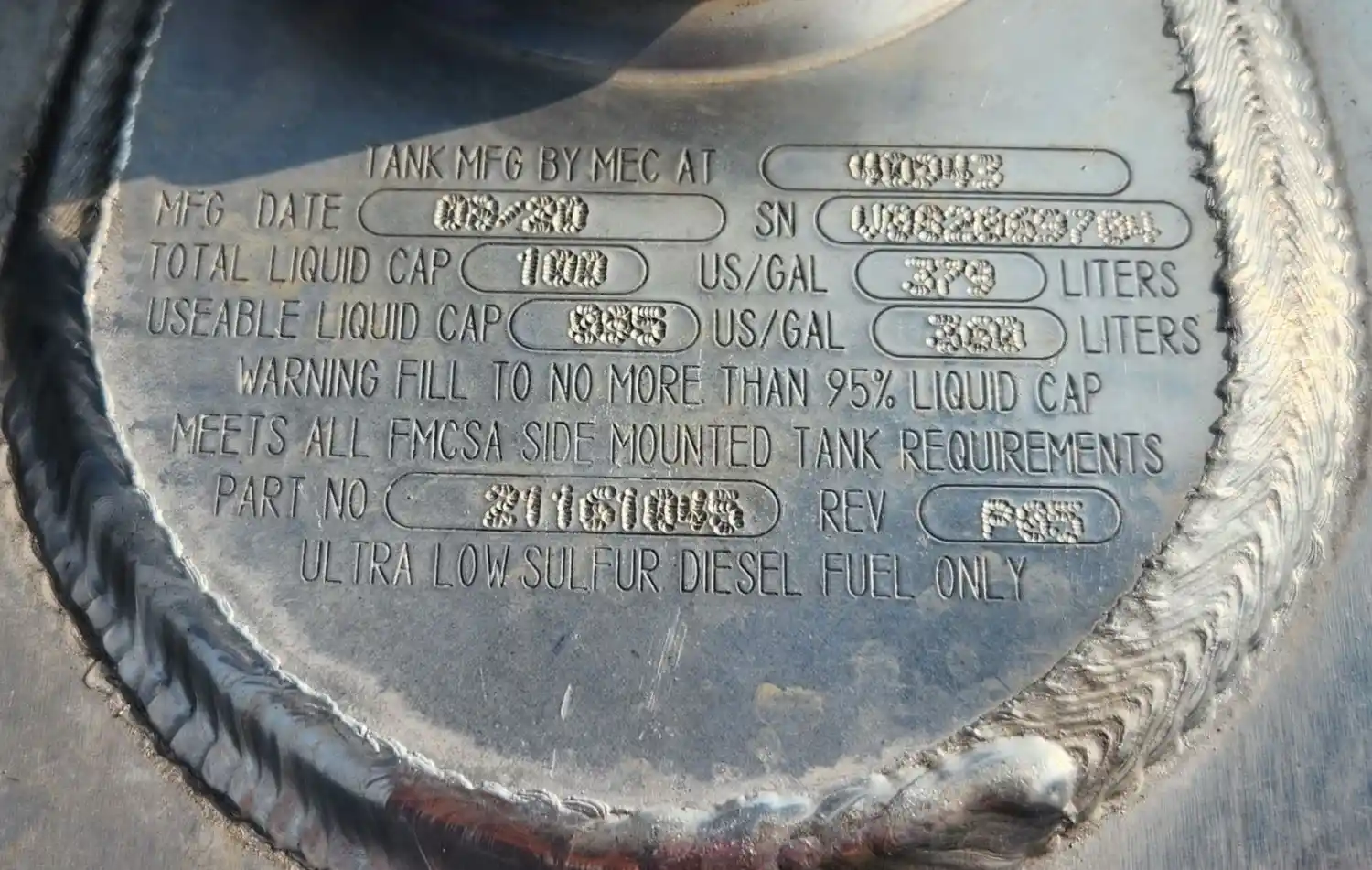 (Used) 2021 Volvo VNL, FUEL TANK- Side: Driver Left Side, Capacity: 100 Gallons, Material: Aluminum, Shape: Cylinder, Dimensions: Length=45", Height=26", Part Number: 21161045, Serial Number: V082069704, ,