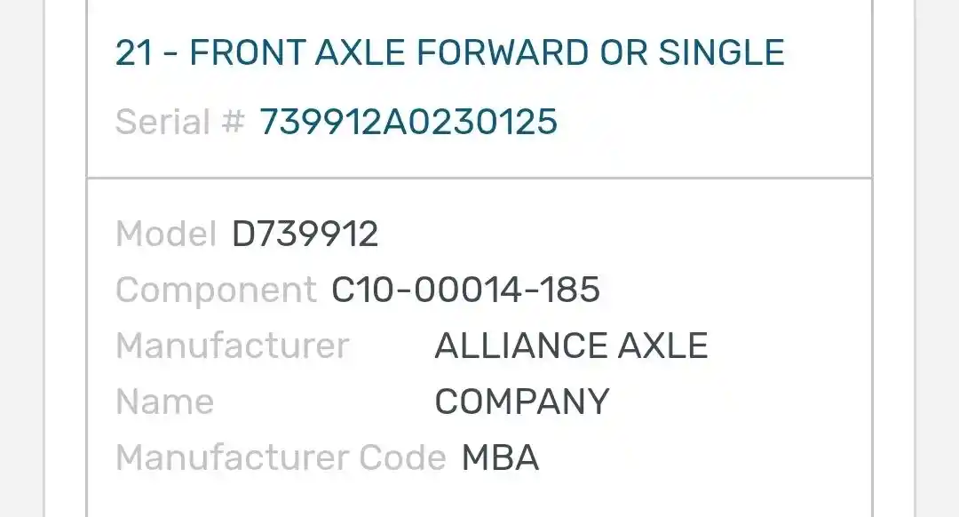 (Used) 2021 Western Star 49X, COMPLETE FRONT AXLE- Serial Number: 739912A0230125, Part Number: C10-00014-185, Center Leaf to Center Leaf: 33", Make: Detroit, Model: D739912, Capacity: 14,320 Lbs, Hub Bolts: 10, Brake Type: Drum, Reference images for condition, ,