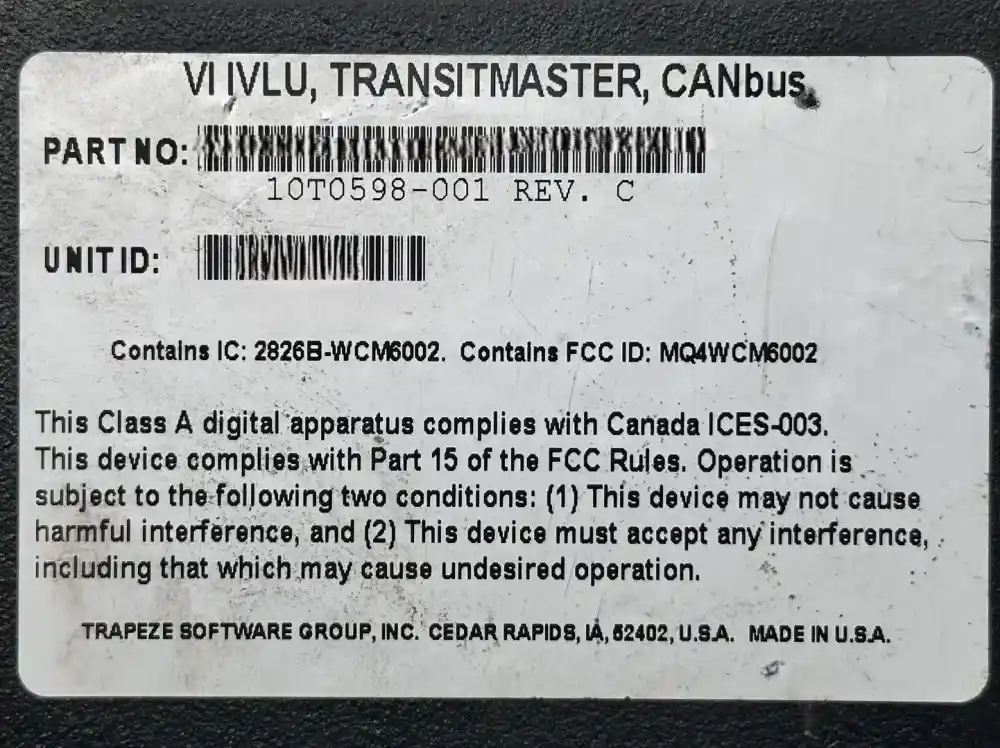 (Used) New Flyer D40 LF, TRANSITMASTER- Make: TRAPEZE, Part Number: 10T0598-001 REV C, 3 Rectangular Plug with 32 Pins each, 1 Rectangular Plug with 30 Pins, 1 Rectangular Plug with 18 Pins, 1 Rectangular Plug with 12 Pins, Reference images for condition. ,